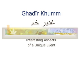 The document discusses the event of Ghadir Khumm, where the Prophet Muhammad declared Ali as his successor and emphasized the importance of the Quran and his family. Over 100,000 companions witnessed the event, with 110 identified narrators documenting it in Islamic sources, making it one of the most well-attested occurrences in the Prophet's life. It highlights the reactions of key figures, such as Umar ibn al-Khattab, and references various sources about the event's significance and its implications for leadership within the Muslim community.