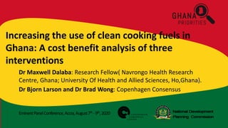 The document presents a cost-benefit analysis of three interventions aimed at increasing the use of clean cooking fuels in Ghana to improve public health and reduce exposure to harmful smoke from solid fuels. It highlights the promotion of improved cookstoves, expanded distribution of LPG in rural areas, and the elimination of LPG taxes, detailing their associated costs, benefits, and benefit-cost ratios (BCRs). The findings indicate that while improved cookstoves offer significant health benefits, expanding LPG access has the potential to greatly enhance overall safety and efficiency in cooking practices.