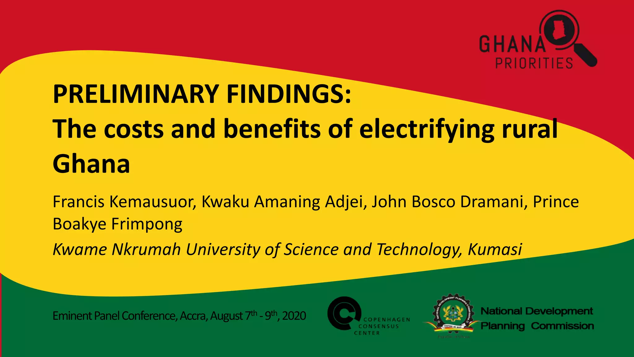 The document discusses a study on the costs and benefits of electrifying rural Ghana, revealing that while 85% of Ghana's population had electricity access in 2019, still about 67.2% of rural areas remained unelectrified. The study analyzes three electrification options: grid expansion to less remote areas, solar and diesel microgrids for more remote communities, and grid expansion to all communities with populations above 100. Findings indicate that grid expansion is the most cost-effective solution for less remote areas, while solar and diesel microgrids, although more expensive, may be viable for remote communities.