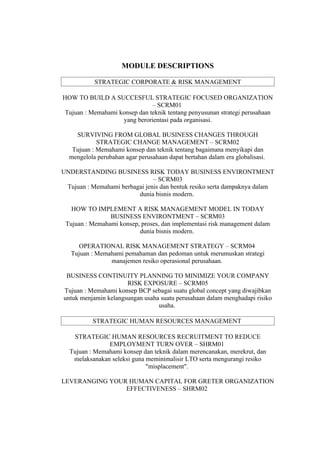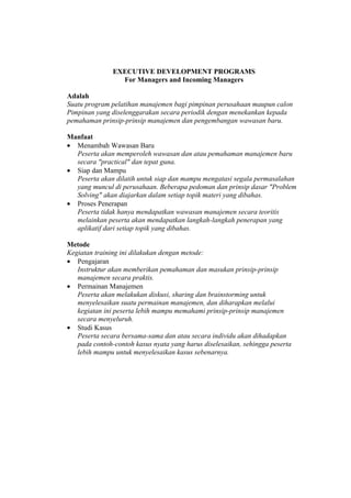 Program pengembangan eksekutif bagi manajer dan calon manajer bertujuan untuk meningkatkan pemahaman manajemen praktis dan kemampuan menyelesaikan masalah dalam perusahaan. Metode pelatihan mencakup pengajaran langsung, permainan manajemen, dan studi kasus untuk penerapan teori dalam praktik. Modul-modul yang ditawarkan meliputi manajemen risiko, manajemen sumber daya manusia, kinerja bisnis, dan akuntansi, dirancang untuk menciptakan tenaga kerja kompeten dan siap pakai.