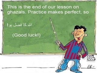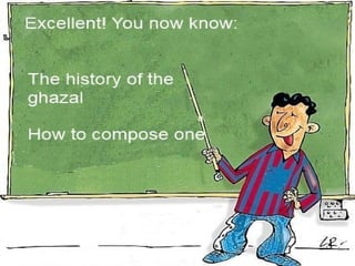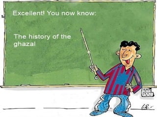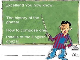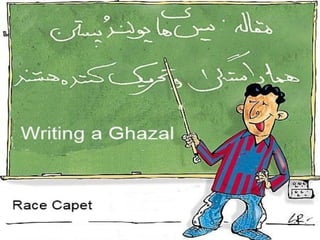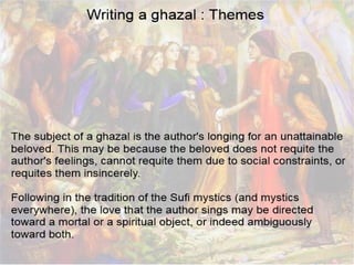 The ghazal is a poetic form that originated in Arabic poetry and became popular in Persian and Urdu literature. It is structured in couplets that must rhyme and can stand independently. The 13th century Persian poet Rumi is one of its most famous practitioners. The ghazal form emphasizes universal themes of love and loss. It was further popularized in English by the poet Agha Shahid Ali through original ghazals that demonstrate the form's construction and challenges of adapting it to the English language.