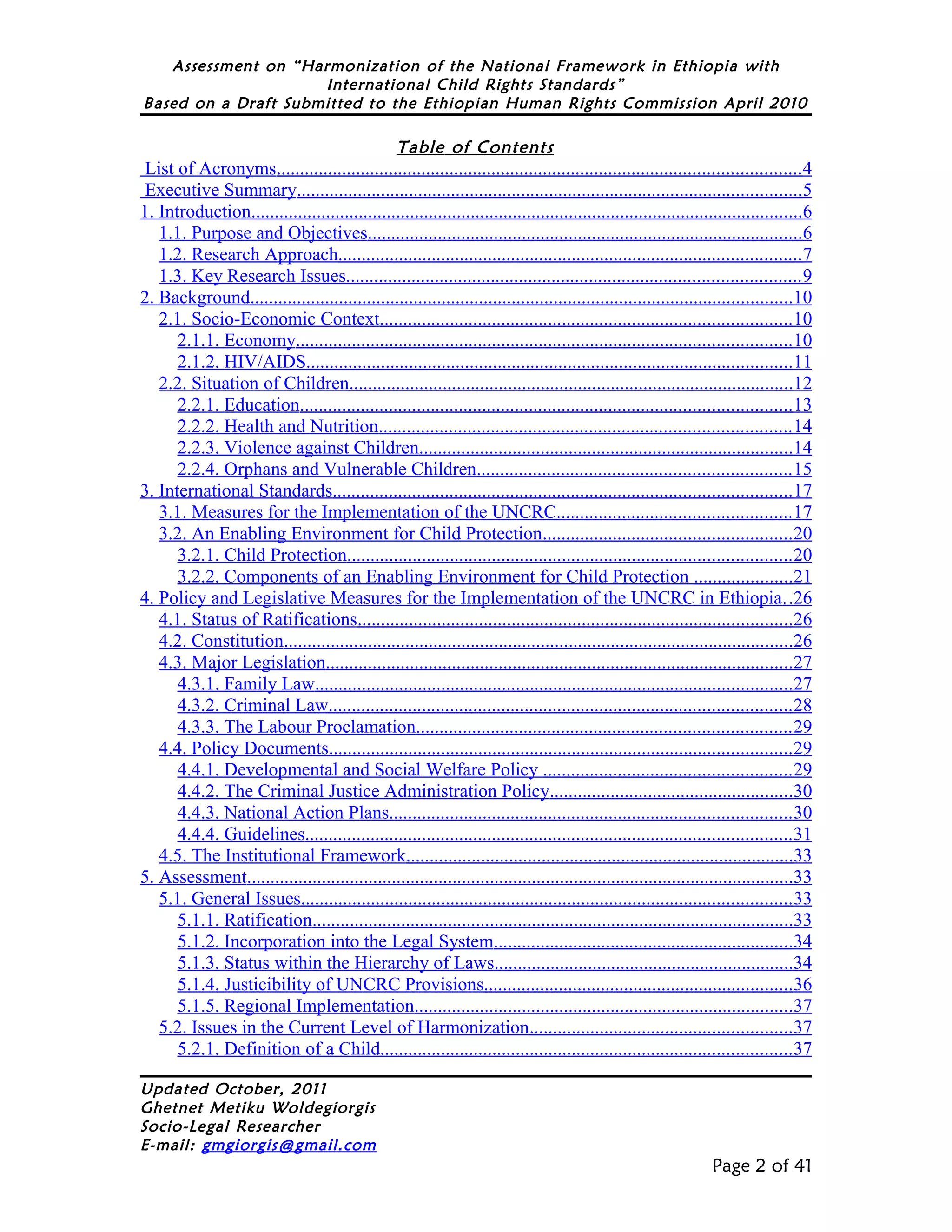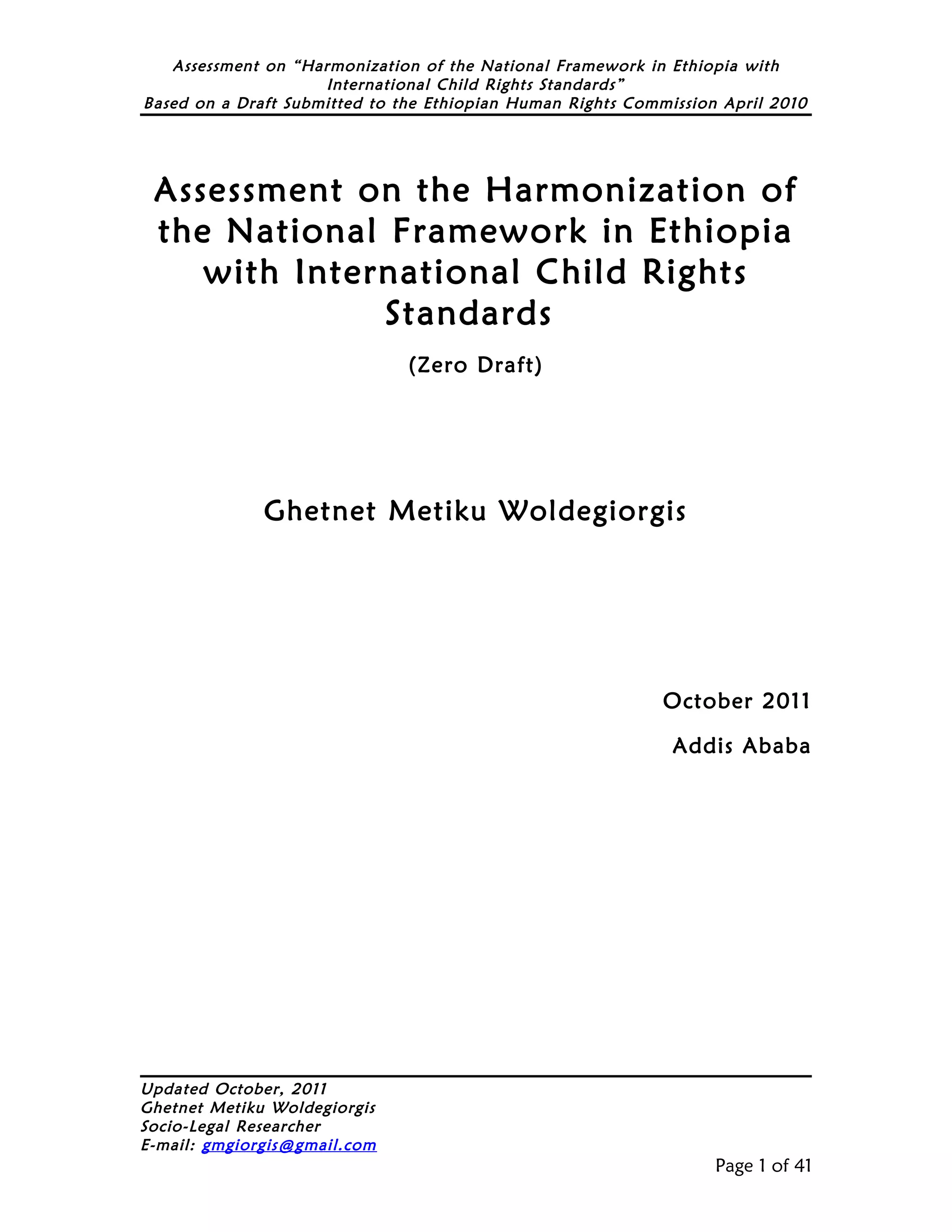 This document assesses the harmonization of Ethiopia's national framework with international child rights standards. It finds that while Ethiopia has ratified key treaties and adopted relevant policies and legislation, there are still gaps in incorporating international standards. The definition of a child differs between domestic and international law. Not all general principles of child rights are addressed, and some civil rights and special protections for children are not fully realized. The document recommends further harmonizing Ethiopian law with the UN Convention on the Rights of the Child and other international standards to strengthen protections for children.