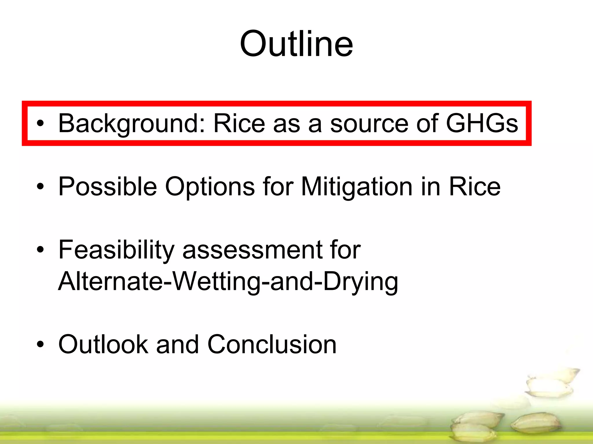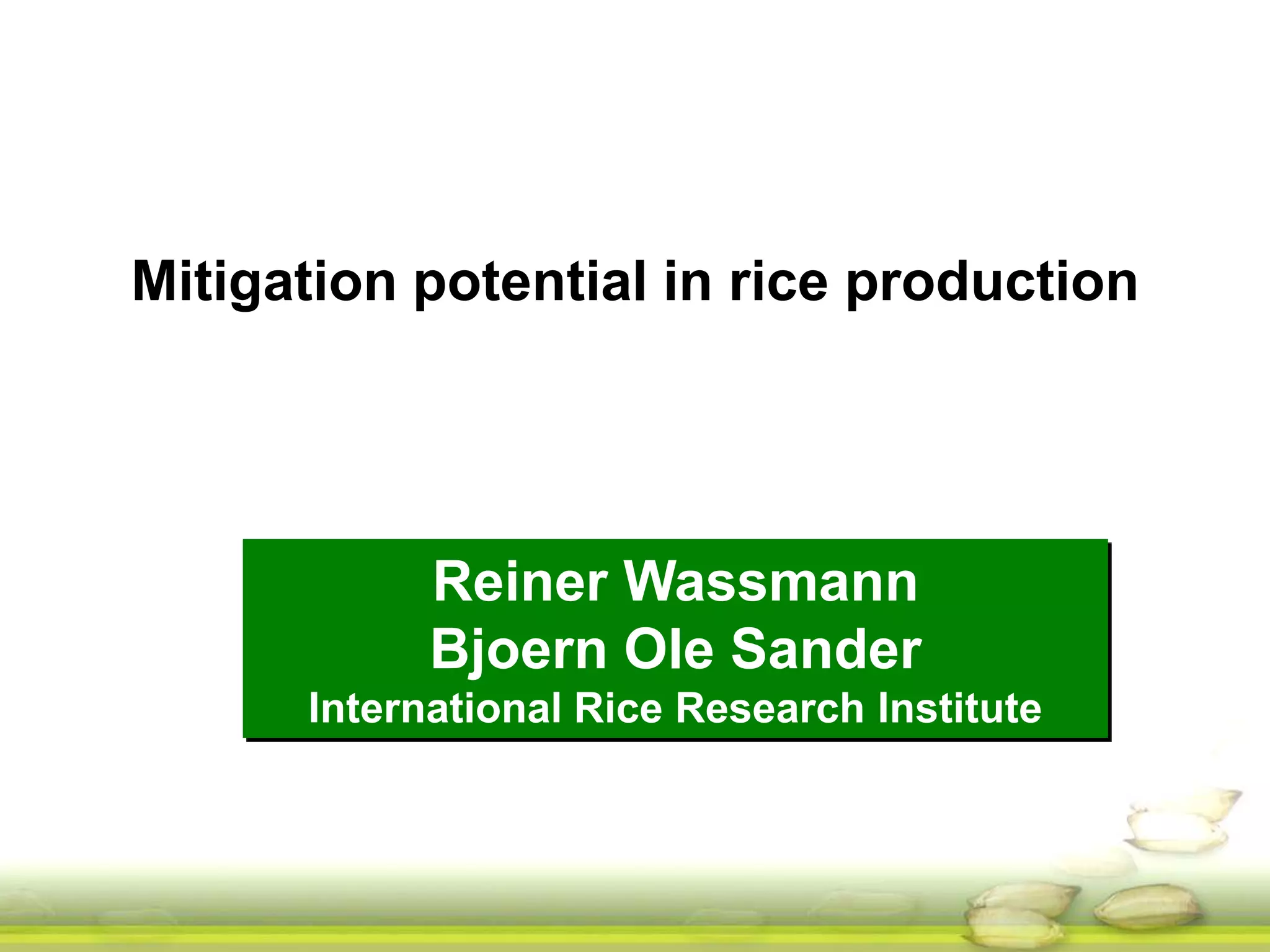 The document discusses the greenhouse gas emissions from rice production and explores mitigation strategies like alternate-wetting-and-drying (AWD) irrigation to reduce methane emissions and conserve water. It highlights the significance of rice cultivation in greenhouse gas budgets and promotes the adoption of AWD as a feasible water-saving technique that can also enhance rice productivity. The report concludes with an emphasis on the need for tailored information and support for stakeholders in implementing these mitigation options.