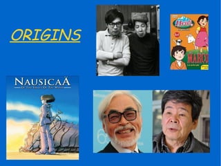 This document discusses the differences between Studio Ghibli and other animation studios. It also analyzes the topics and human characters in Hayao Miyazaki's film Princess Mononoke, including the futility of wars, uncontrolled exploitation of natural resources, and analyses of human behavior. The film was directed by Isao Takahata.