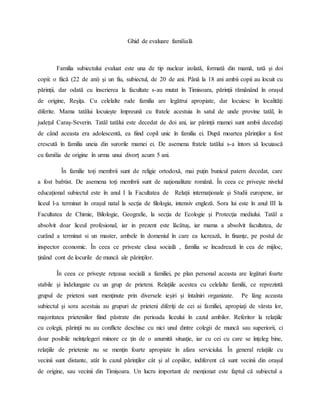 Documentul prezintă evaluarea unei familii nucleare formată din părinți și doi copii ajunși la vârsta adultă, evidențiind aspecte precum relațiile interumane, nivelul educațional și social, precum și problemele financiare. Familia se confruntă cu tensiuni generate de situația materială și a relațiilor interne, în special între mamă și copii, dar menține legături strânse cu grupul de prieteni. În general, comunicarea între membrii familiei este bună, cu anumite conflicte care apar dar sunt gestionate prin discuții deschise.