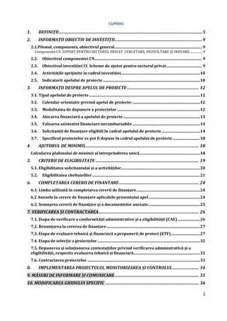 Documentul prezintă condițiile de accesare a fondurilor europene printr-un apel de proiecte din cadrul planului național de redresare și reziliență, axat pe sprijinul sectorului privat în domeniul cercetării, dezvoltării și inovării, cu accent pe digitalizarea IMM-urilor. Acesta include informații despre tipurile de finanțare disponibile, criteriile de eligibilitate, procedurile de depunere și evaluare a proiectelor, precum și aspecte administrative legate de implementare. Ministerul Investițiilor și Proiectelor Europene are rolul de coordonator în acest proces, asigurându-se că regulile și condițiile de finanțare sunt respectate.