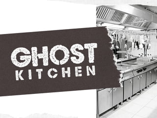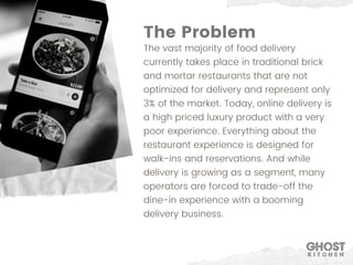 The document discusses the growth of the food delivery market and the opportunity for "delivery-only" restaurant concepts without a physical space. It introduces the idea of "ghost kitchens" which allow the creation of high-profit, low-risk restaurant ventures through renting small kitchen spaces. The document proposes a "ghost kitchen" concept called Ghost Kitchen that would license brands of popular defunct national and local restaurants in order to satisfy consumer demand and nostalgia through food delivery apps.