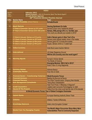 This document provides an overview of the global economic situation in early 2012. It discusses the financial crisis calling into question economic models in the US, Europe, and potentially Asia. While some took pleasure in others' struggles, the document argues all major economies are vulnerable. It concludes that no single model guarantees perpetual success or security in a globalized market economy prone to constant change.