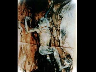 This document presents several photographs claimed to show ghosts or supernatural phenomena. Three of the photos show unexplained figures appearing alongside living people or in the background of family photos. Another photo shows an unidentified figure in some caves where a man was later found dismembered. The document suggests these photos provide evidence of ghosts or supernatural occurrences.