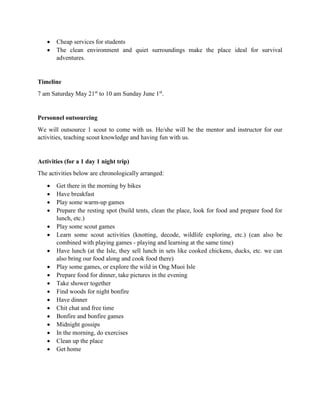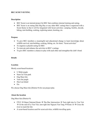 The document describes plans for a BEC Scout outing involving camping, hiking, cooking and other scout activities. It will take place May 21-22 on Ong Muoi Isle, located near Hanoi, Vietnam. The outing aims to educate members about wilderness skills while strengthening bonds between members. A scout instructor will be hired to teach activities and ensure fun is had by all during the 1 day and 1 night trip.
