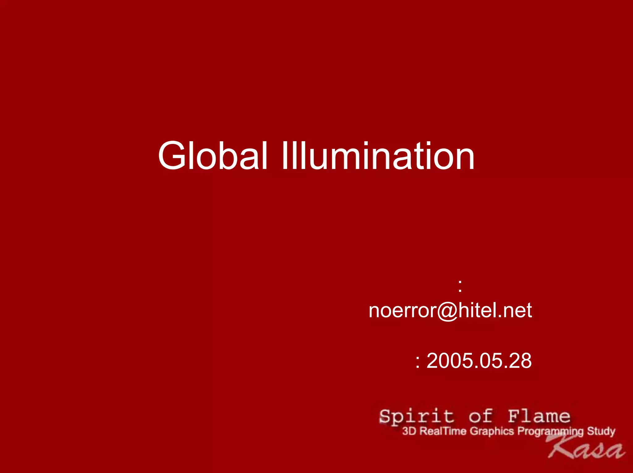 The document discusses global illumination techniques, including direct illumination, indirect illumination, radiosity, and photon mapping. Radiosity involves subdividing surfaces into patches and calculating light transport between patches. It was introduced in 1984. Photon mapping is a two-pass Monte Carlo method where photons are traced in the first pass to construct a photon map, which is then used in the second pass for rendering. It was introduced in 1995 and uses techniques like Russian roulette. Both radiosity and photon mapping can be used to simulate indirect illumination in games and productions.