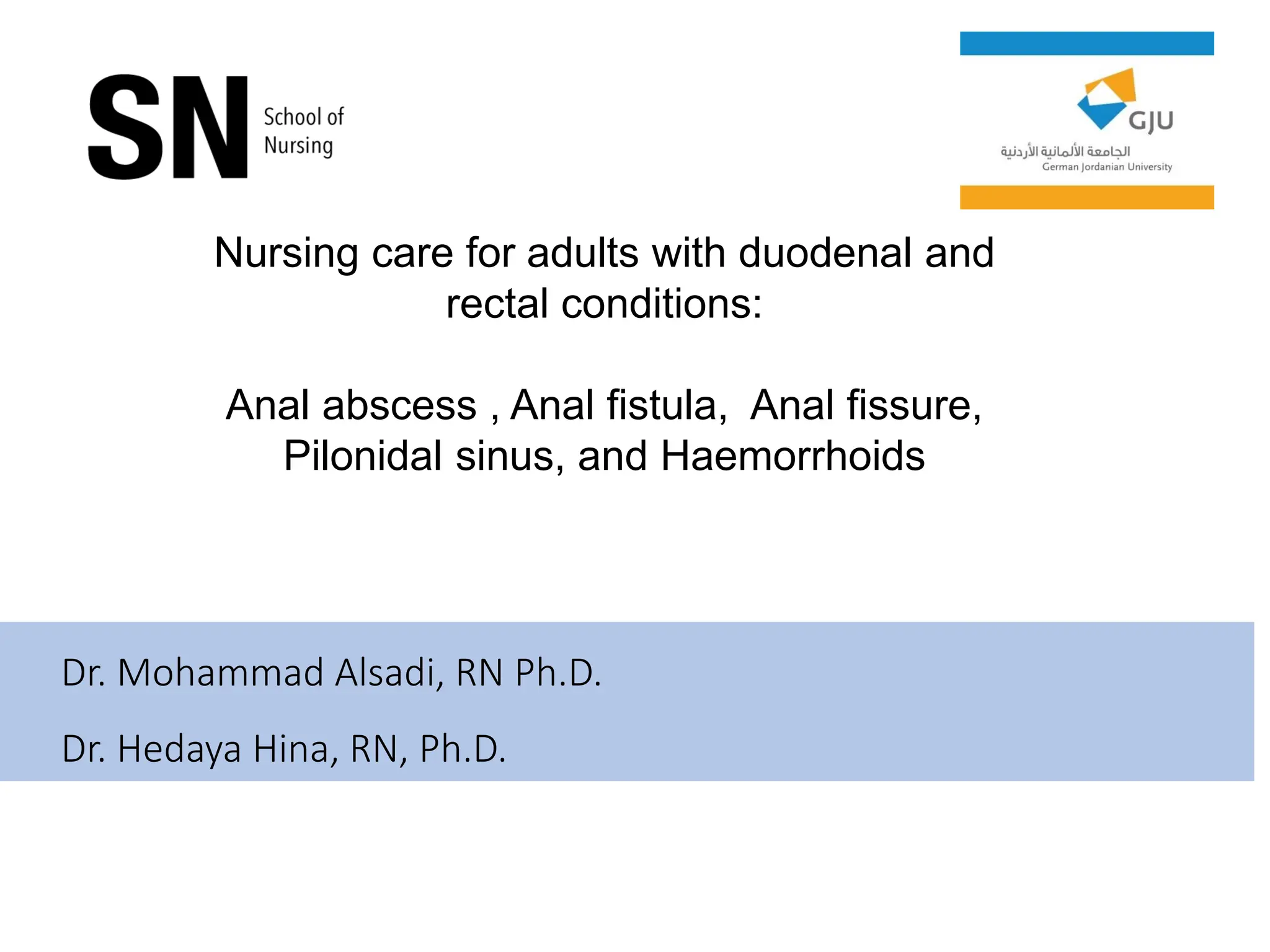 This document outlines nursing care for adults with various anorectal conditions such as anal abscess, fistula, fissure, pilonidal sinus, and hemorrhoids. It covers definitions, pathophysiology, causes, clinical manifestations, management strategies, and nursing processes involved in patient care for these conditions. Treatment options include dietary management, pharmacotherapy, surgical interventions, and patient education for effective recovery.