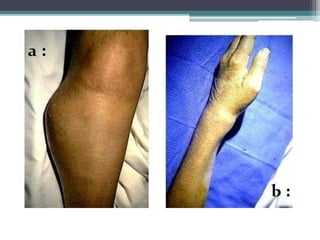 This document provides an overview of giant cell tumor, a type of benign bone tumor. It discusses the definition, epidemiology, clinical presentation, investigations, grading, differential diagnosis, and treatment options. Giant cell tumor commonly involves the ends of long bones and is locally aggressive, destroying bone tissue. While benign, it can occasionally metastasize. Treatment typically involves curettage with the use of adjuvants like phenol or bone cement to reduce the high risk of recurrence. Reconstruction of residual defects is often done with bone grafts or cement.