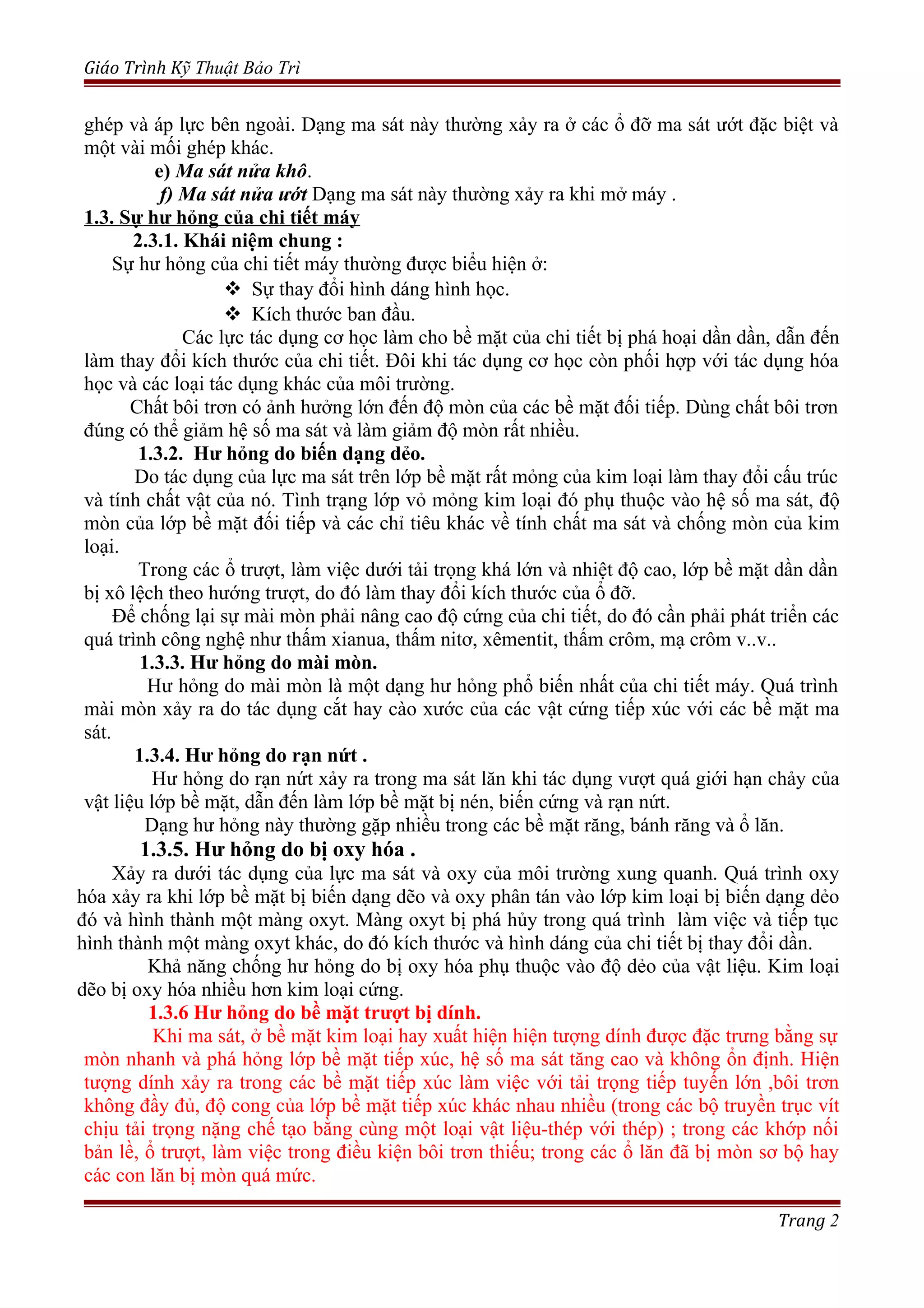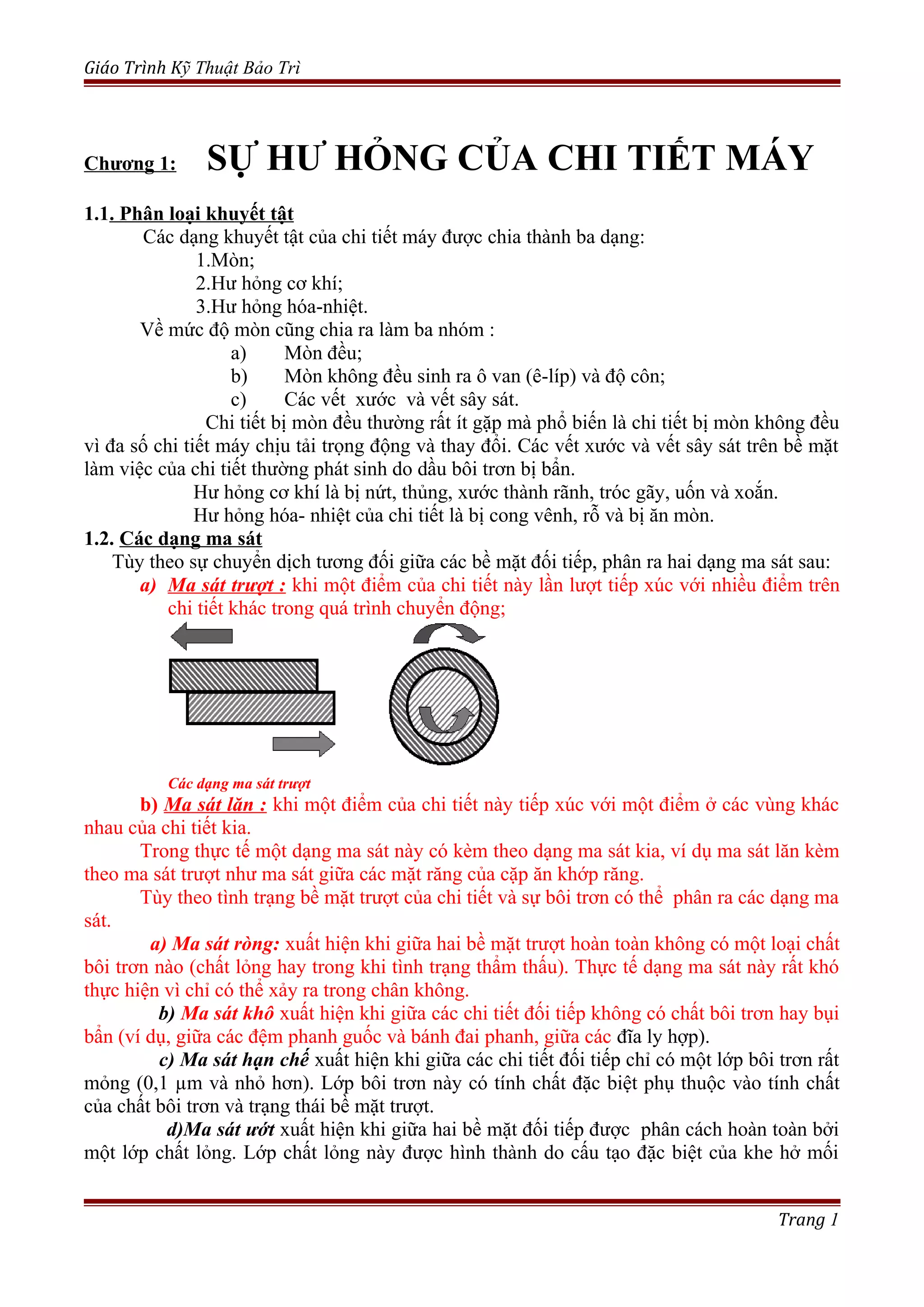 Chương 1 của giáo trình kỹ thuật bảo trì trình bày về sự hư hỏng của chi tiết máy, phân loại các dạng khuyết tật gồm mòn, hư hỏng cơ khí và hư hỏng hóa-nhiệt. Các hình thức ma sát và sự ảnh hưởng của chất bôi trơn đối với độ mòn cũng được nêu rõ, cùng với những nguyên nhân và phương pháp tìm khuyết tật ở chi tiết máy. Bên cạnh đó, chương cũng đề cập đến quy trình tháo lắp máy với các yêu cầu và nguyên tắc an toàn trong bảo trì.