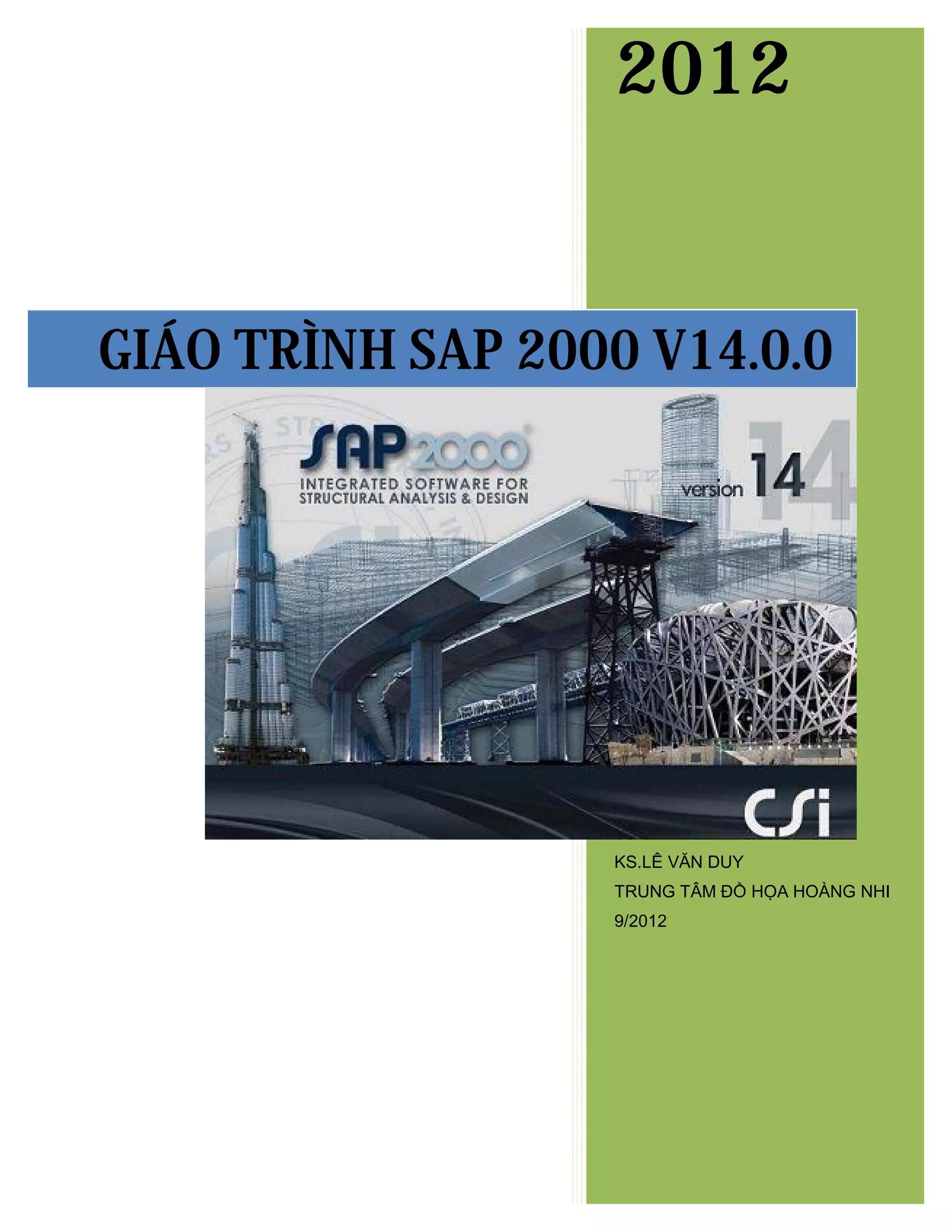 Tài liệu cung cấp hướng dẫn chi tiết về phần mềm SAP 2000 phiên bản 14.0.0, bao gồm các công cụ cơ bản, quy trình tính toán và phân tích kết cấu. Nó bao gồm các phần như định nghĩa vật liệu, tiết diện, phương án tải, gối tựa và cách đọc kết quả phân tích. Nội dung cũng cung cấp các hình ảnh minh họa và hướng dẫn cài đặt cho người dùng.
