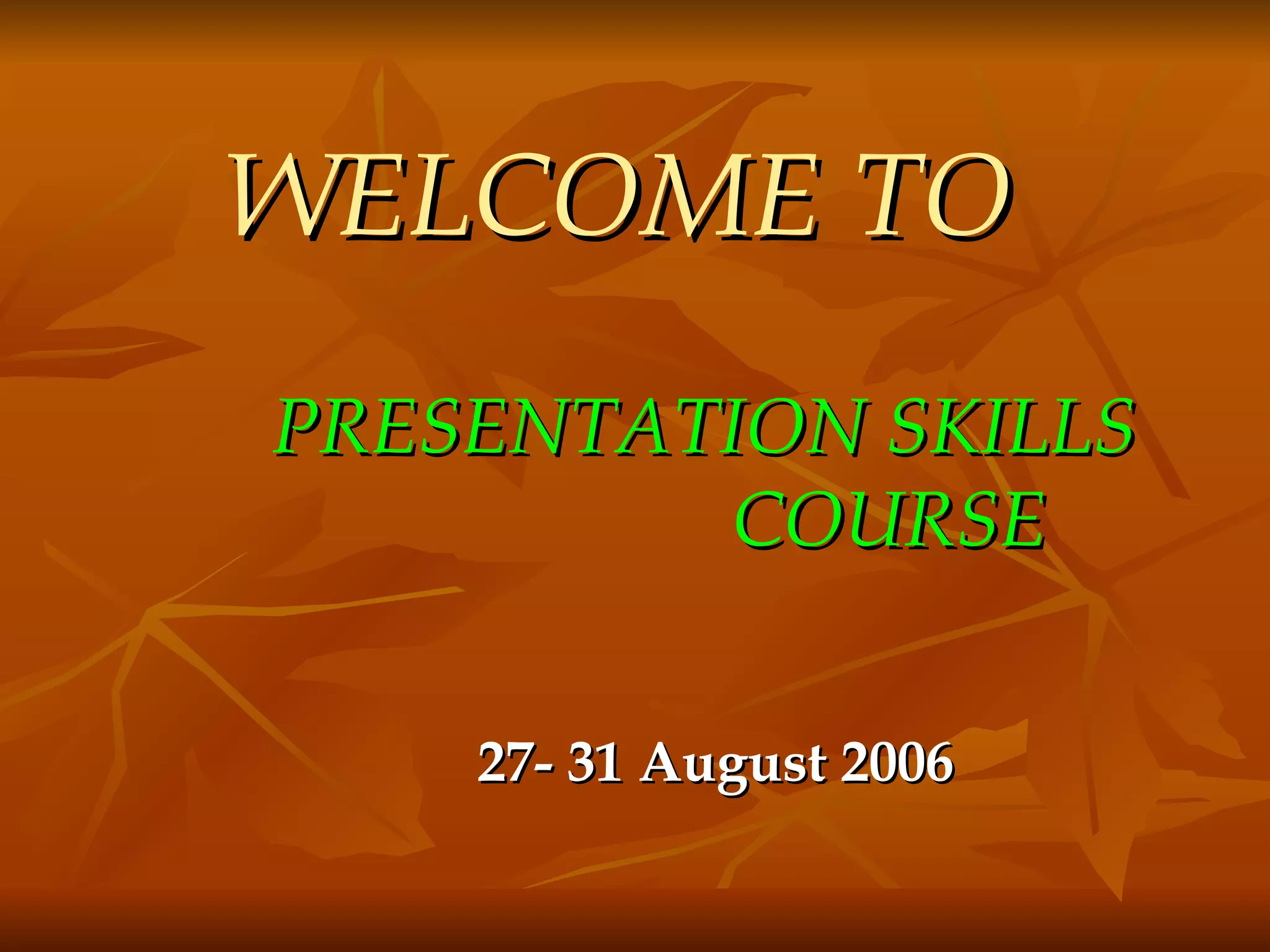 The document provides an overview of a 5-day course on presentation skills from August 27-31, 2006. The objectives are to help participants effectively prepare and deliver presentations through defining objectives and audience, organizing content clearly, designing and using visual aids, and practicing delivery skills. The course will cover preparing an outline and structure, visual aids, rehearsing, and techniques for voice control and handling questions.