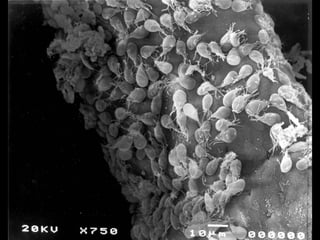Giardia duodenalis is a flagellated protozoan parasite that causes giardiasis. It has both a trophozoite and cyst stage. The trophozoite lives in the small intestine where it attaches to epithelial cells and feeds on mucus, interfering with absorption. It can cause diarrhea and malabsorption. The cyst forms when trophozoites pass through the large intestine and are excreted in feces. Cysts are hardy and infect new hosts when ingested. Giardiasis is common worldwide and transmitted through contaminated water. Treatment involves metronidazole antibiotics.