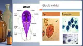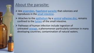 Giardia lamblia, also known as Giardia intestinalis, is a flagellated parasite that infects the small intestine. It attaches to the intestinal epithelium where it remains confined and reproduces, causing symptoms like diarrhea and abdominal cramps. Giardia spreads primarily through ingestion of contaminated water or food. While the trophozoite form was first observed in 1681, outbreaks continue to occur where sanitation is poor. Treatment involves antibiotics like metronidazole or tinidazole taken orally for 5-10 days.