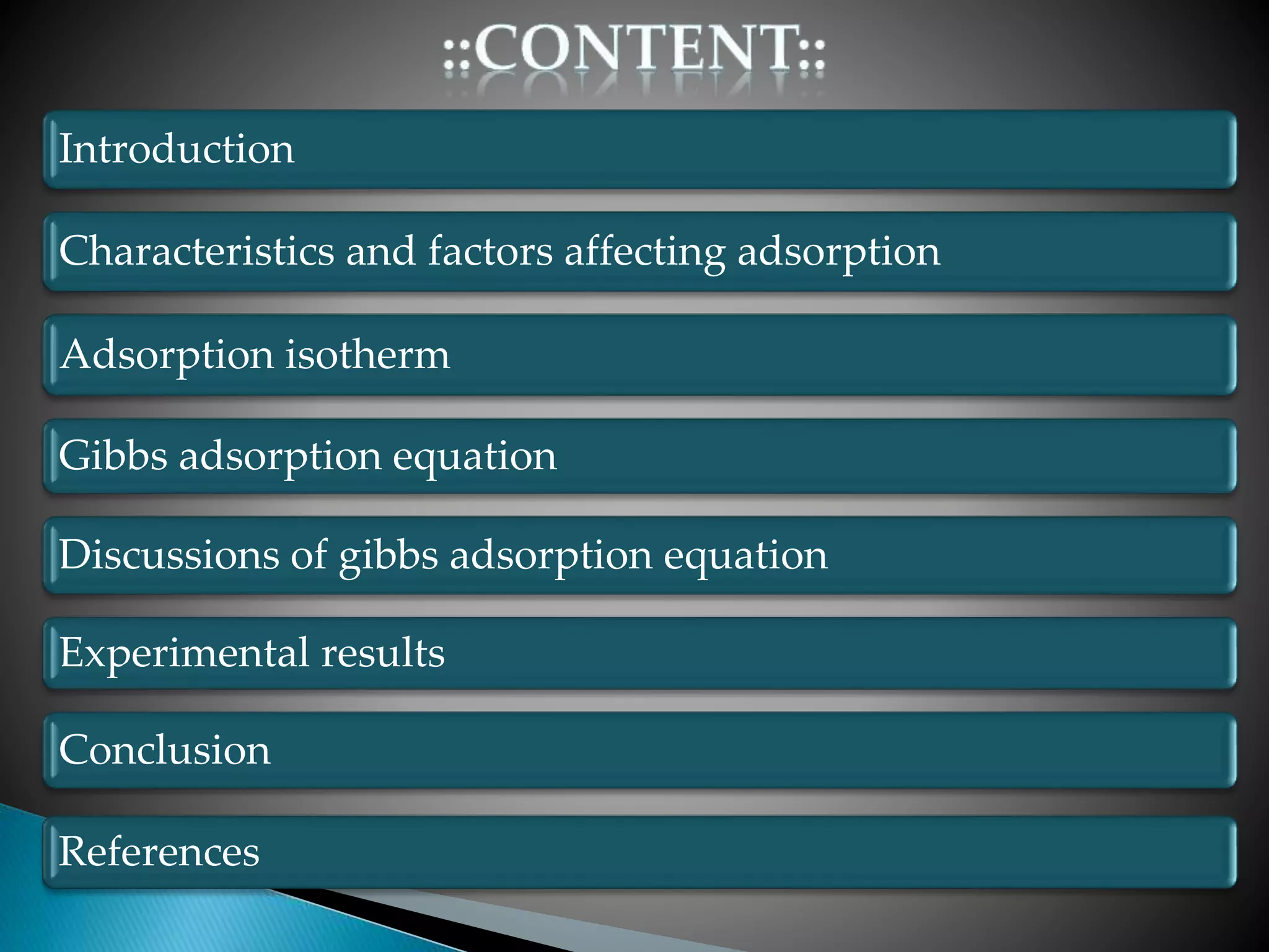 The document discusses adsorption and the Gibbs adsorption equation. It defines adsorption as molecules of a gas or liquid being attracted to and retained on the surface of a solid. Absorption occurs when a substance is uniformly distributed throughout a solid or liquid. The Gibbs adsorption equation relates changes in surface tension to changes in solute concentration at an interface. It shows that the surface excess concentration of a solute is proportional to the negative of the derivative of surface tension with respect to solute activity. The document also lists factors that affect adsorption and describes adsorption isotherms.