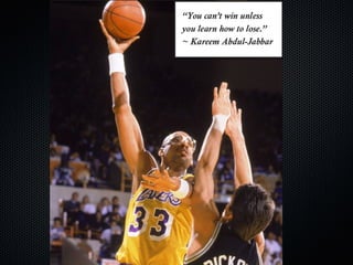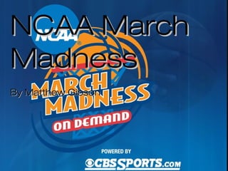 This document provides an overview of the NCAA March Madness tournament. It discusses how the tournament originated in 1939 under Harold Olsen and now includes 68 teams. It explains how teams are selected and provides results from recent tournaments, noting that Kentucky won in 2012 and Louisville won in 2013. It also lists teams with the most championships (UCLA), appearances (Kentucky), and wins (John Wooden). John Wooden is highlighted for his success coaching UCLA and players like Kareem Abdul-Jabbar.