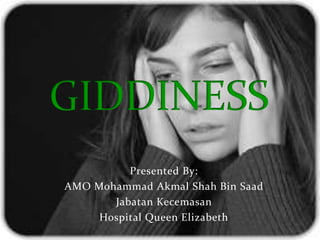 This document presents information on giddiness/dizziness, including definitions, types, causes, investigations, and management. It discusses the difference between true vertigo and non-vertiginous giddiness. Common causes of giddiness include cardiac, orthostatic, metabolic, and hematological conditions. Initial workup of a patient with significant giddiness should include vital sign checks, glucose testing, ECG, and lab tests. Unsteady patients require monitoring and treatment in an intermediate care area.