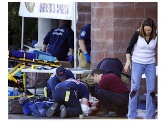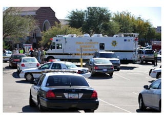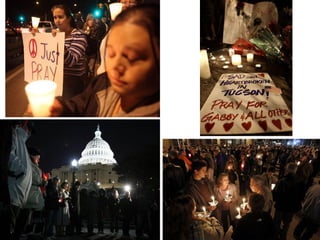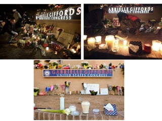 The document discusses the shooting of Gabrielle Giffords and analyzes it in the context of gun culture and rhetoric in the United States. It mentions key details like the shooter Jared Loughner using a Glock 19 pistol with an extended capacity magazine to shoot Giffords and others. It also discusses responses from Sarah Palin, the NRA, and gun rights groups as well as calls for less violent political rhetoric in the aftermath of the shooting.