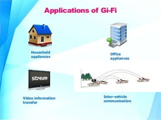 This document provides an introduction to Gi-Fi technology. It discusses how Gi-Fi allows wireless transfer of audio and video data at up to 5 gigabits per second, which is 10 times faster than current WiFi maximum transfer rates within a 10 meter range. The document outlines the architecture of Gi-Fi including its small antenna subscriber station and use of time division duplex. It compares Gi-Fi to WiFi, noting Gi-Fi's higher speed, lower cost, power usage and range. Potential applications and considerations for the technology are also mentioned.