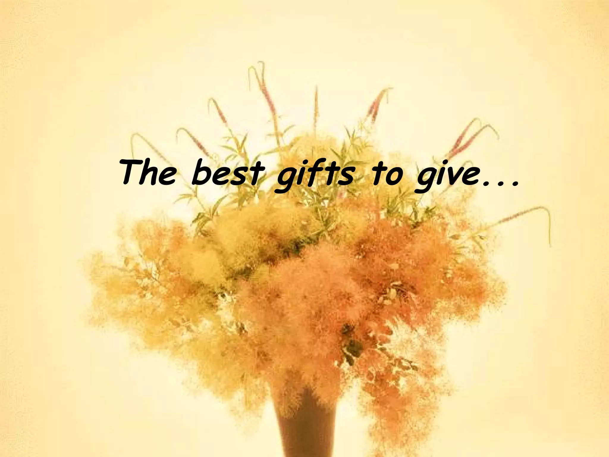 This document provides advice on the best gifts to give to different people in one's life, suggesting giving loyalty to friends, forgiveness to enemies, service to bosses, a good example to children, gratitude and devotion to parents, love and faithfulness to mates, love to all people, and giving your life to God. It concludes by wishing the reader a blessed day.