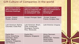 This document discusses the history and etiquette of gift giving around the world. It begins with an introduction on the symbolic meaning of gifts and presents. The history section describes gift giving traditions in ancient Rome. The etiquette section provides guidelines for appropriately presenting and wrapping gifts. The document also covers superstitions associated with certain gifts in different cultures and globally appreciated present ideas. It concludes by noting the relationship benefits of gift exchange.