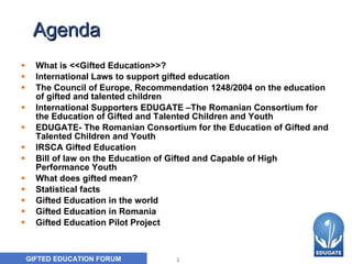 The document discusses gifted education in Romania. It provides context on international laws supporting gifted education, outlines the mission of EDUGATE - the Romanian Consortium for the Education of Gifted and Talented Children and Youth, and discusses its partnerships with international organizations like the World Council for Gifted and Talented Children.