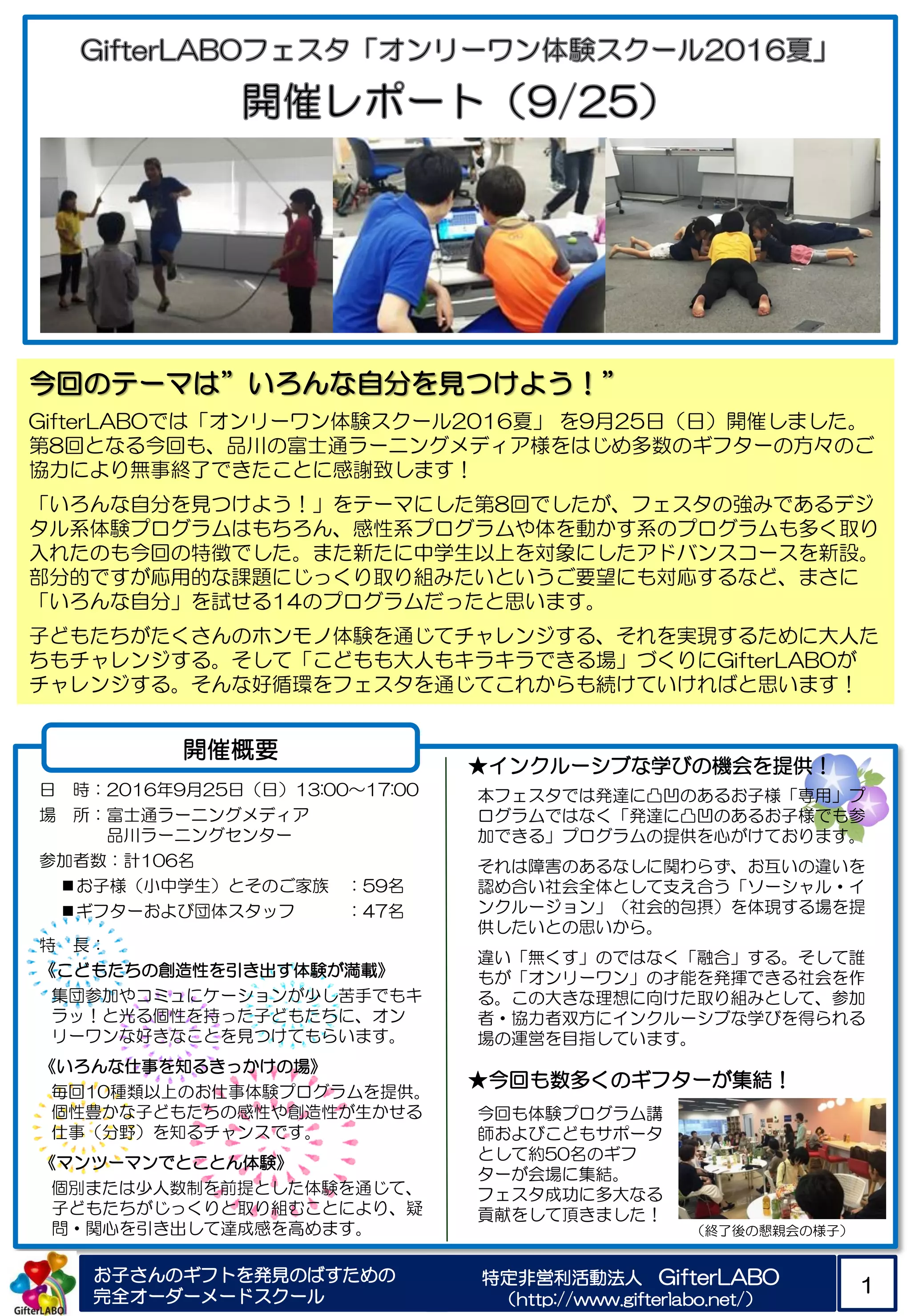 開催概要 今回のテーマは”いろんな自分を見つけよう!” GifterLABOでは「オンリーワン体験スクール2016夏」 を9月25日(日)開催しました。 第8回となる今回も、品川の富士通ラーニングメディア様をはじめ多数のギフターの方々のご 協力により無事終了できたことに感謝致します! 「いろんな自分を見つけよう!」をテーマにした第8回でしたが、フェスタの強みであるデジ タル系体験プログラムはもちろん、感性系プログラムや体を動かす系のプログラムも多く取り 入れたのも今回の特徴でした。また新たに中学生以上を対象にしたアドバンスコースを新設。 部分的ですが応用的な課題にじっくり取り組みたいというご要望にも対応するなど、まさに 「いろんな自分」を試せる14のプログラムだったと思います。 子どもたちがたくさんのホンモノ体験を通じてチャレンジする、それを実現するために大人た ちもチャレンジする。そして「こどもも大人もキラキラできる場」づくりにGifterLABOが チャレンジする。そんな好循環をフェスタを通じてこれからも続けていければと思います! お子さんのギフトを発見のばすための 完全オーダーメードスクール 特定非営利活動法人 GifterLABO (http://www.gifterlabo.net/) 1 (終了後の懇親会の様子) 日