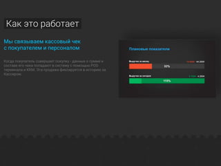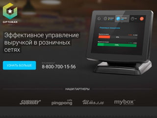 Гифтоман - система управление выручкой розничных предприятий Объем продаж всегда сильно зависит от активности и качества работы персонала, общающегося с покупателем и удовлетворенности покупателя этой работой. Обычно система мотивации фронт-персонала и программа лояльности покупателей не связаны напрямую между собой. И в этом кроется большой риск для бизнеса, потому что удовлетворенность покупателя, его желание возвращаться и покупать еще раз, напрямую зависят от работы фронт-персонала. И наоборот, средний чек, количество покупок в чеке, выручка - то есть параметры, на увеличение значений которых обычно мотивируется фронт-персонал, напрямую зависят от активности продавцов и удовлетворенности покупателей их работой. Система управления выручкой Гифтоман дает возможность эффективно увязать между собой цели менеджмента предприятия, KPI фронт-персонала и удовлетворенность (лояльность) покупателей. Использование системы Гифтоман приводит к значительному увеличению эффективности работы продавцов и их активности, достижению поставленных менеджментом KPI, желанию хорошо обслужить покупателей. С другой стороны, Гифтоман дает инструменты для постоянного мониторинга удовлетворенности покупателей, получения от них обратной связи о работе продавцов. Кроме того, за счет использования системы мотивации как покупателей, так и продавцов на покупку-продажу определенных групп товаров (например, при проведении маркетинговых акций) удается добиться существенного увеличения количественных показателей продаж целевых продуктов. Как Гифтоман добивается таких результатов? Ключевой элемент Гифтоман - передовая