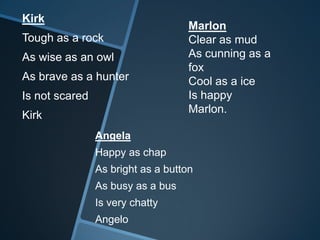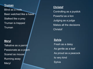 The document contains three sections that each compare two characters to different objects or concepts using similes. The first section compares Truman and Christof, the second compares Meryl and Sylvia, and the third compares Kirk, Marlon, and Angela using similes to describe their personalities and traits.