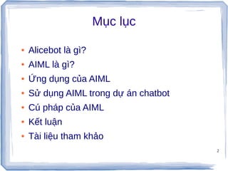 Tài liệu giới thiệu về AIML (Artificial Intelligence Markup Language) và ứng dụng của nó trong việc phát triển chatbot. AIML sử dụng cú pháp XML để xác định các kịch bản giao tiếp, bao gồm các thẻ như <category>, <pattern>, và <template> để xử lý và phản hồi các câu hỏi của người dùng. Ngoài ra, tài liệu cũng đề cập đến các khái niệm như recursion, context, và cách quản lý câu trả lời khi đầu vào không khớp với bất kỳ pattern nào.