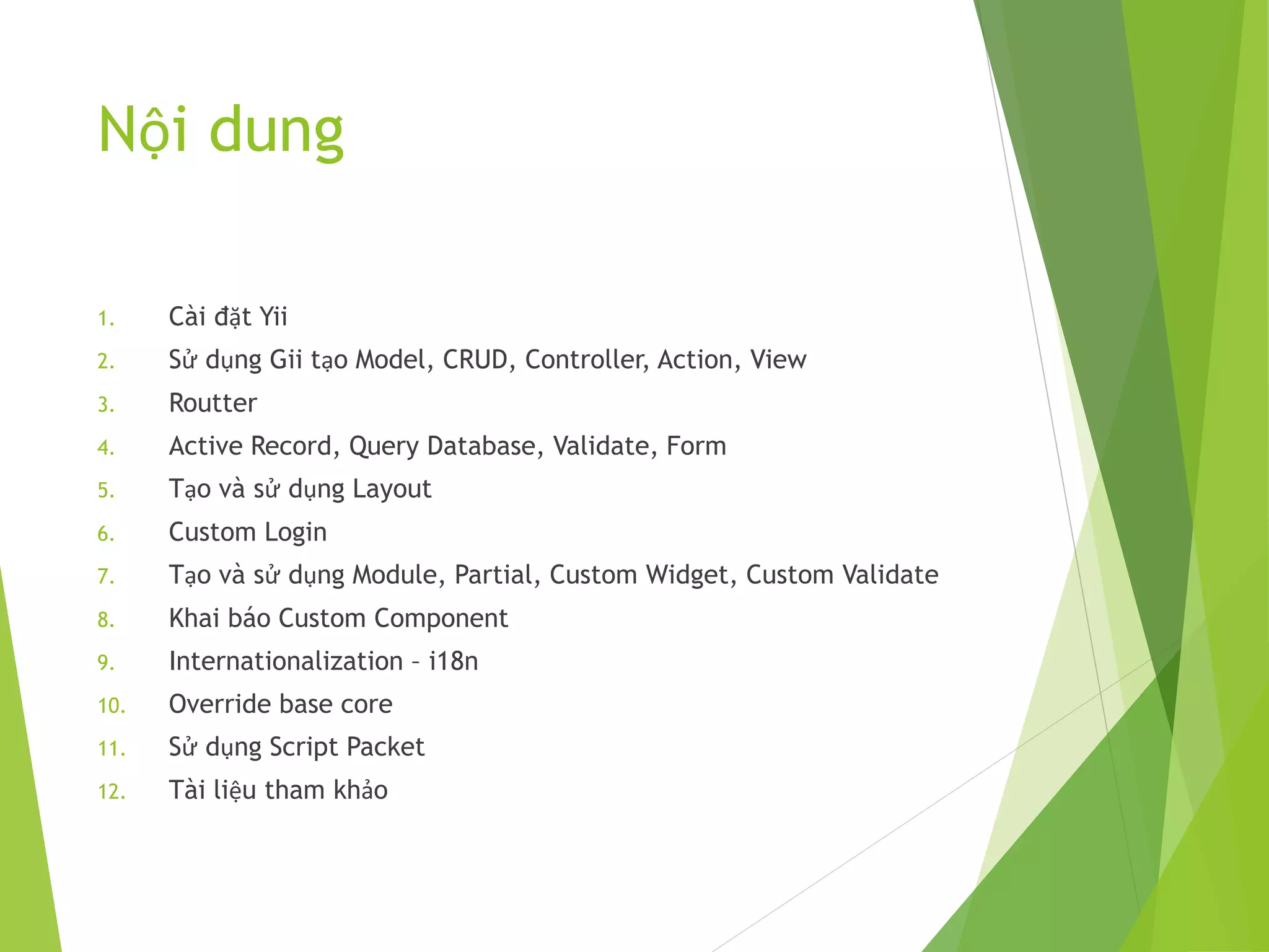 Tài liệu giới thiệu về Yii Framework 1, bao gồm cài đặt, sử dụng công cụ Gii để tạo model, controller, và view, cũng như các tính năng như Active Record và custom login. Nó cũng đề cập đến routing, quản lý layout, tạo module, widget, và các thành phần tùy chỉnh khác. Cuối cùng, tài liệu trình bày về quốc tế hóa (i18n) và cách sử dụng script package để tổ chức tài nguyên JavaScript và CSS.
