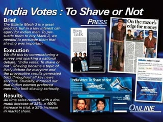 3. Gillette has a range of products including razors, deodorants, shaving creams, and batteries acquired through Duracell. It focuses on branding, innovation, and prioritizing profitable product lines in India.
