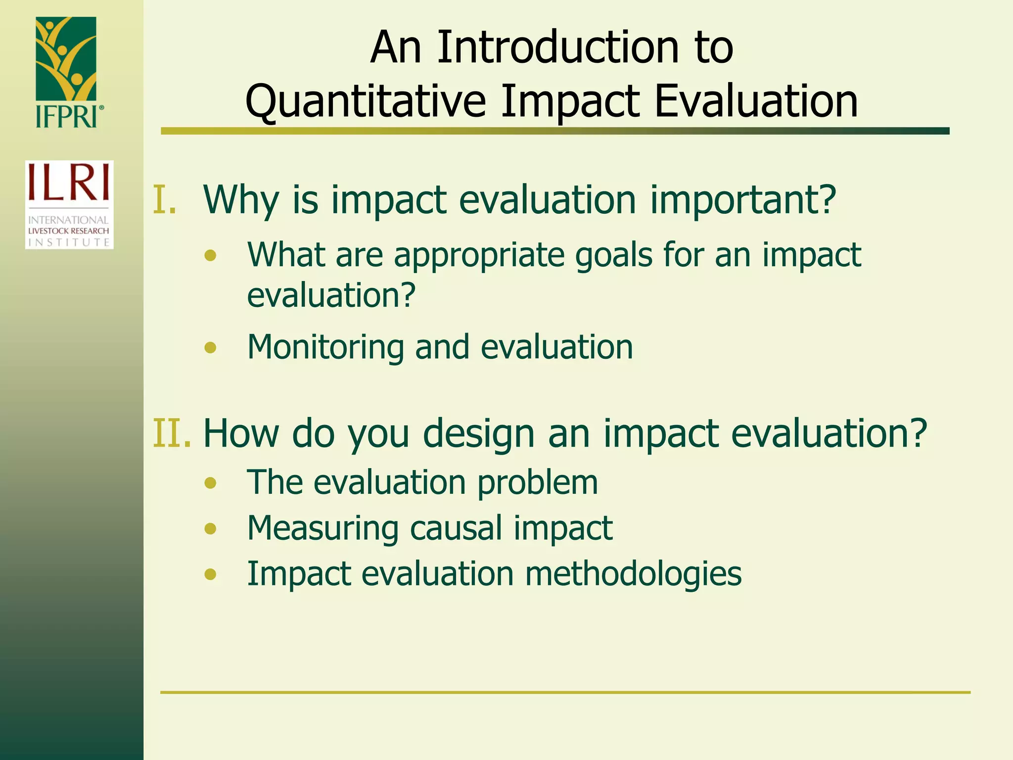 This document provides an introduction to quantitative impact evaluation methods. It discusses why impact evaluations are important, how to design an evaluation, and common evaluation tools and methodologies. Key points include: impact evaluations measure a program's causal effects, require a comparison group to estimate counterfactual outcomes, and use methods like randomization, matching, regression discontinuity, and difference-in-differences to construct valid comparisons. The goals of evaluations are to measure impacts, assess cost-effectiveness, and explain which program components are most effective.
