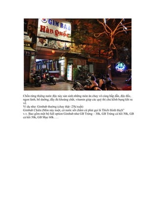 Nhà hàng Gimbab Hàn Quốc, khai trương ngày 06/03/2011 tại 12 Nguyễn Khánh Toàn, Hà Nội, chuyên phục vụ các món ăn kiểu Hàn, đặc biệt là gimbab và bibimbap. Giá cả hợp lý với nhiều lựa chọn đa dạng từ gimbab chay đến các món thịt nướng, cùng với các loại đồ uống truyền thống Hàn Quốc. Khách hàng được khuyến khích đến thưởng thức ẩm thực trong không gian thoải mái và phục vụ tận tình.