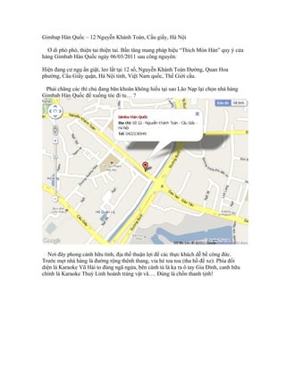 Nhà hàng Gimbab Hàn Quốc, tọa lạc tại 12 Nguyễn Khánh Toàn, Hà Nội, nổi tiếng với các món gimbab và bibimbap ngon miệng, hấp dẫn. Được mở cửa vào ngày 06/03/2011, nơi đây không chỉ có không gian thanh tịnh mà còn phục vụ đa dạng các món ăn chay và đồ uống, với giá cả hợp lý. Nhà hàng thu hút thực khách bằng chất lượng món ăn, dịch vụ tận tình và sự tiện lợi trong chỗ đậu xe.