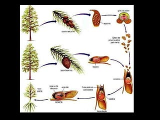 This document discusses the key parts of gymnosperms including their cones, seeds, stems, leaves, and roots. It specifically mentions the ovuliferous scales within cones that contain ovules which develop into seeds once the cone opens.
