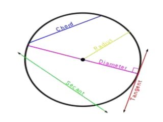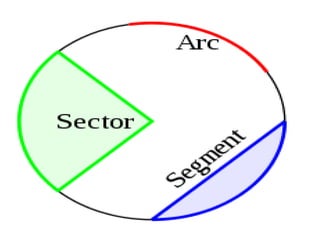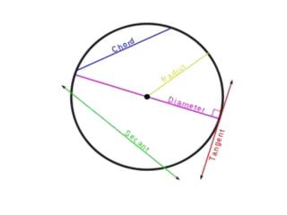 2) Key parts of a circle include the radius, diameter, circumference, chord, secant, tangent, arc, sector, and segment. The circumference is related to the diameter by pi.