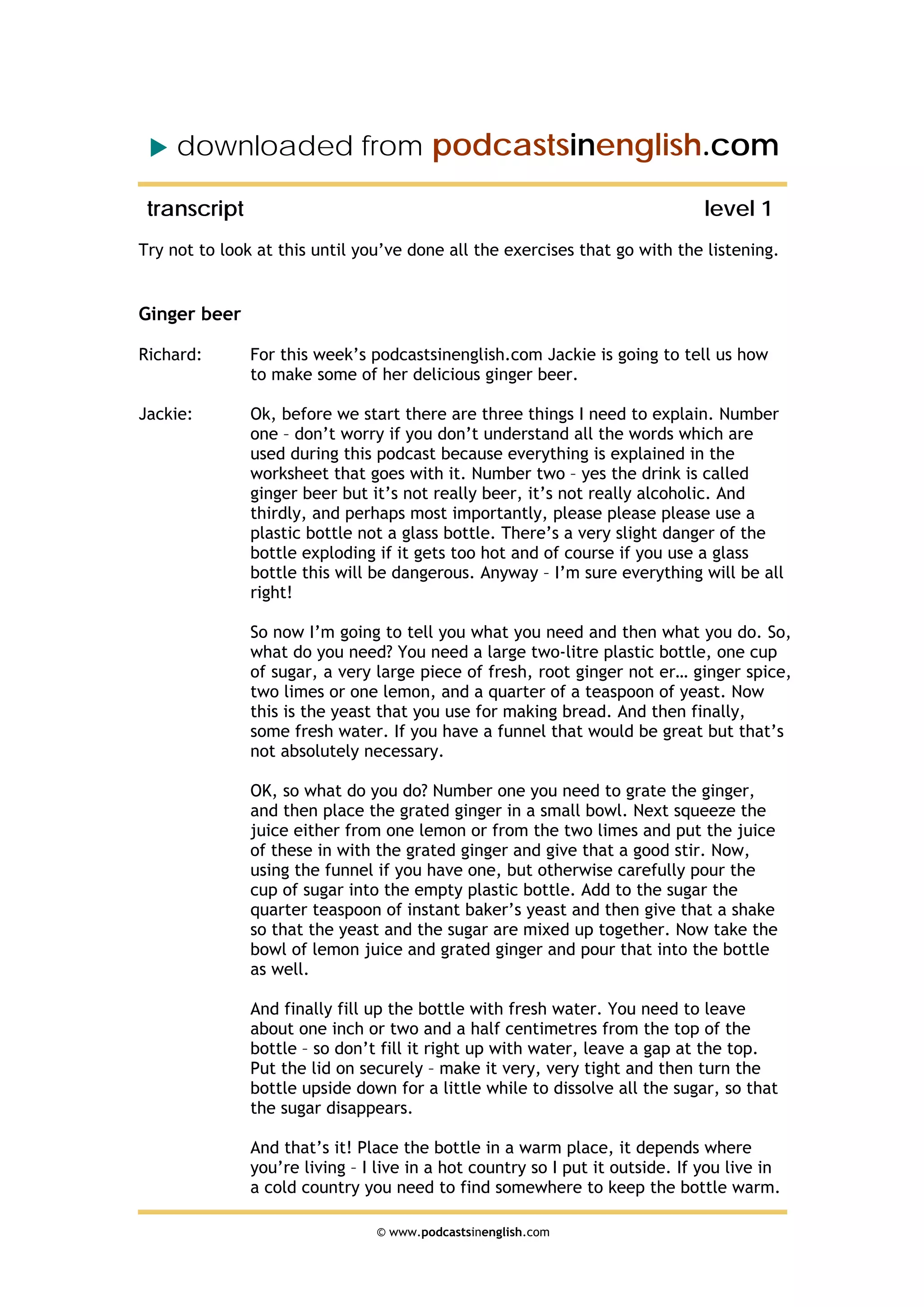 Jackie explains how to make homemade ginger beer in this podcast. She notes that the drink is non-alcoholic and stresses using a plastic bottle instead of glass to avoid explosions from pressure buildup. The ingredients needed are a 2-liter plastic bottle, 1 cup of sugar, fresh ginger root, 2 limes or 1 lemon, 1/4 teaspoon of yeast, and water. The ginger is grated and mixed with citrus juice before adding to the bottle along with the sugar, yeast, and filling with water, leaving 1-2 inches from the top. The capped bottle is turned upside down and left in a warm place for 24-48 hours before opening slightly to release gas and refrigerating. The finished ginger beer