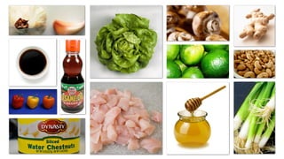 This recipe provides instructions for making ginger chicken lettuce wraps. It involves stir frying chicken with ginger, garlic, peppers, water chestnuts, mushrooms and scallions. The chicken mixture is then served wrapped in bibb lettuce leaves along with lime and soy sauce for dipping.