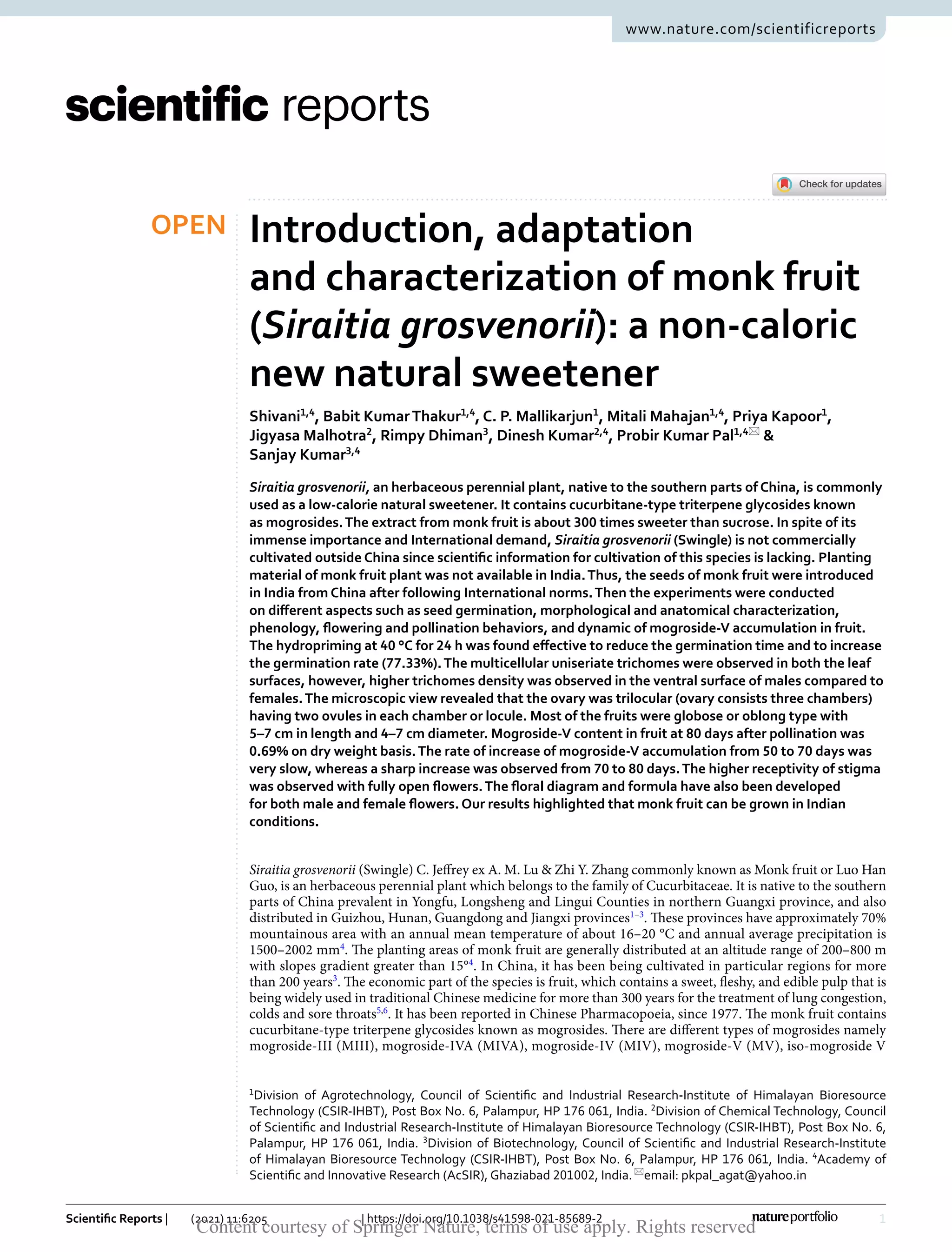 The document discusses the introduction and characterization of monk fruit (Siraitia grosvenorii) as a new natural sweetener in India. Key findings include: