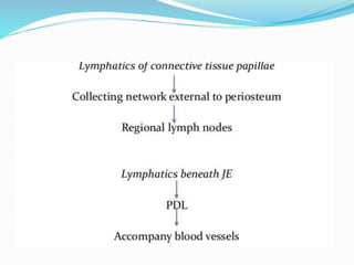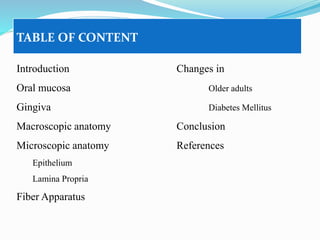The document provides an overview of the anatomy and histology of the gingiva. It discusses the different layers of the gingiva including the marginal gingiva, attached gingiva, and interdental gingiva. Microscopically, it describes the epithelial layers covering the gingiva and the underlying connective tissue layer. Key points include that the gingival epithelium can be parakeratinized, orthokeratinized, or non-keratinized depending on its location. The junctional epithelium attaches to the tooth surface and renews rapidly. The connective tissue layer mainly comprises collagen fibers, vessels, and fibroblasts. Gingival fluid maintains tissue health and possesses antimicrobial properties