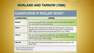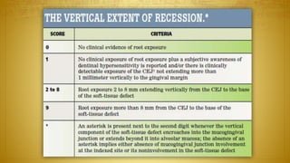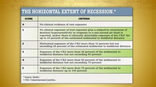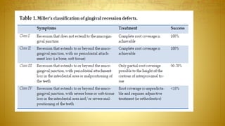 The document provides a comprehensive overview of gingival recession, including definitions, classifications, etiology, and treatment options. It discusses various classifications of gingival recession, limitations of current classifications, and multiple factors contributing to its occurrence. Additionally, it highlights the prevalence of gingival recession in different populations and its implications for dental health.