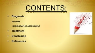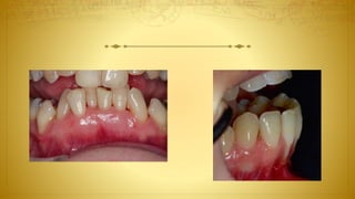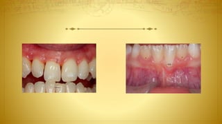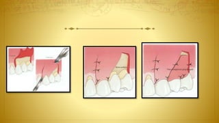 The document discusses the diagnosis and treatment of gingival recession, providing detailed methods for non-surgical and surgical treatments including various grafting procedures. It emphasizes the importance of assessing factors such as dental history, oral hygiene habits, and keratinized tissue quality when planning interventions. Additionally, it outlines specific techniques and their indications, contraindications, and potential outcomes related to tissue grafting and root coverage strategies.
