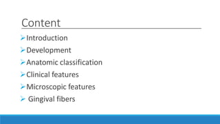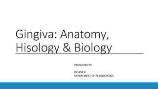 This document discusses the anatomy, histology, and biology of the gingiva. It defines the gingiva and divides it anatomically into the marginal, attached, and interdental gingiva. Microscopically, the gingiva consists of stratified squamous epithelium and underlying connective tissue. The document describes the development, microscopic features including the different areas of gingival epithelium, gingival fibers, blood supply, lymphatics and nerves of the gingiva. It correlates the clinical features of color, size, and contour to the microscopic structure of the gingiva.