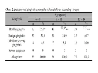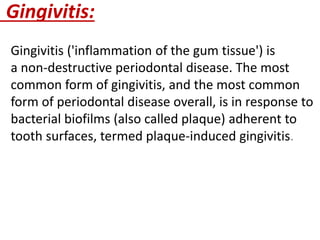 Gingivitis is a non-destructive periodontal disease caused by bacterial biofilms (plaque) on tooth surfaces. It is characterized by swollen, red or purple gums that bleed easily. While gingivitis is reversible with improved oral hygiene, it can progress to periodontitis if left untreated. Risk factors include poor oral hygiene, smoking, stress, certain medical conditions and medications. Gingivitis is treated by removing the bacterial plaque through regular brushing, flossing and professional cleanings.