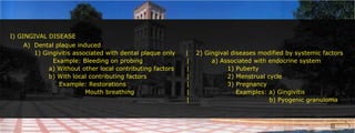 This document provides a classification system for periodontal pathology, dividing it into gingival diseases and periodontitis. It describes various forms of gingival disease including those induced by dental plaque, modified by systemic factors like pregnancy or diabetes, drug-induced forms from medications like phenytoin, and non-plaque induced lesions from conditions such as linear gingival erythema. It also outlines different types of periodontitis including chronic, aggressive, periodontitis associated with systemic diseases, necrotizing forms, abscesses, and lesions associated with endodontic problems. Developed deformities and occlusal trauma are additionally discussed.